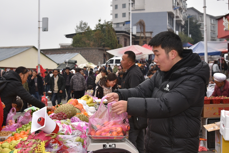 “只有过年的时期,我才能回家与家人团聚。昨天才回到家,今天是赶场,就要买点瓜子、水果、糖果、食品配料等,随便给父母买几件衣服,快快乐乐过新年。”大岩村民方在平在市场挑选货物时说。