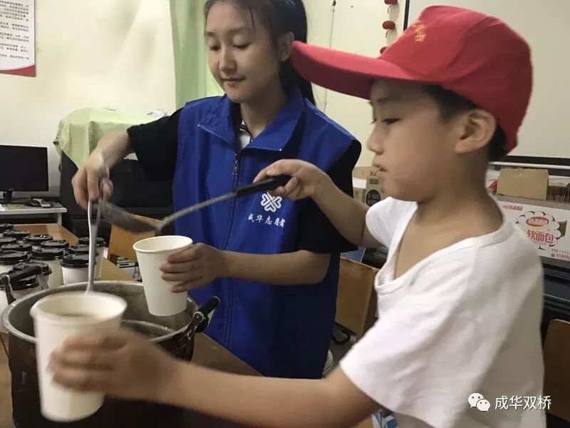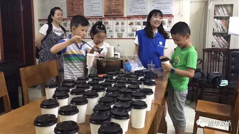 7月5日万晟社区关工委组织了社区的10多名孩子在社区党员义工服务队及招募大学生志愿者的带领下为顶着烈日辛苦工作人们送上1杯绿豆汤。