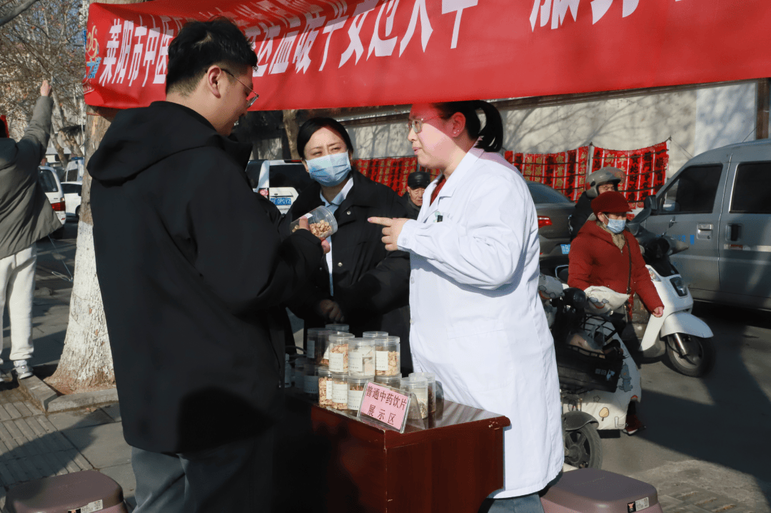 烟台市莱阳中心医院、烟台市心理康复医院、莱阳市中医医院、莱阳市人民医院、莱阳市妇幼保健院、莱阳市城厢街道社区卫生服务中心、山东省中医药高等专科学校附属医院、山东省莱阳卫生学校医院、莱阳复健医院、莱阳市疾病预防控制中心共10家医疗机构携手参与,辖区各卫生院、社区卫生服务中心同步设点服务,活动现场汇聚多学科医疗力量,提供一站式健康服务。活动现场,接地气的中医药科普成为全场焦点,莱阳特产莱胡参(又称“北沙参”)的药食同源知识分享更是圈粉众多,让群众在逛大集、备年货的热闹氛围中,沉浸式感受医疗服务的温度与传统医药的智慧。